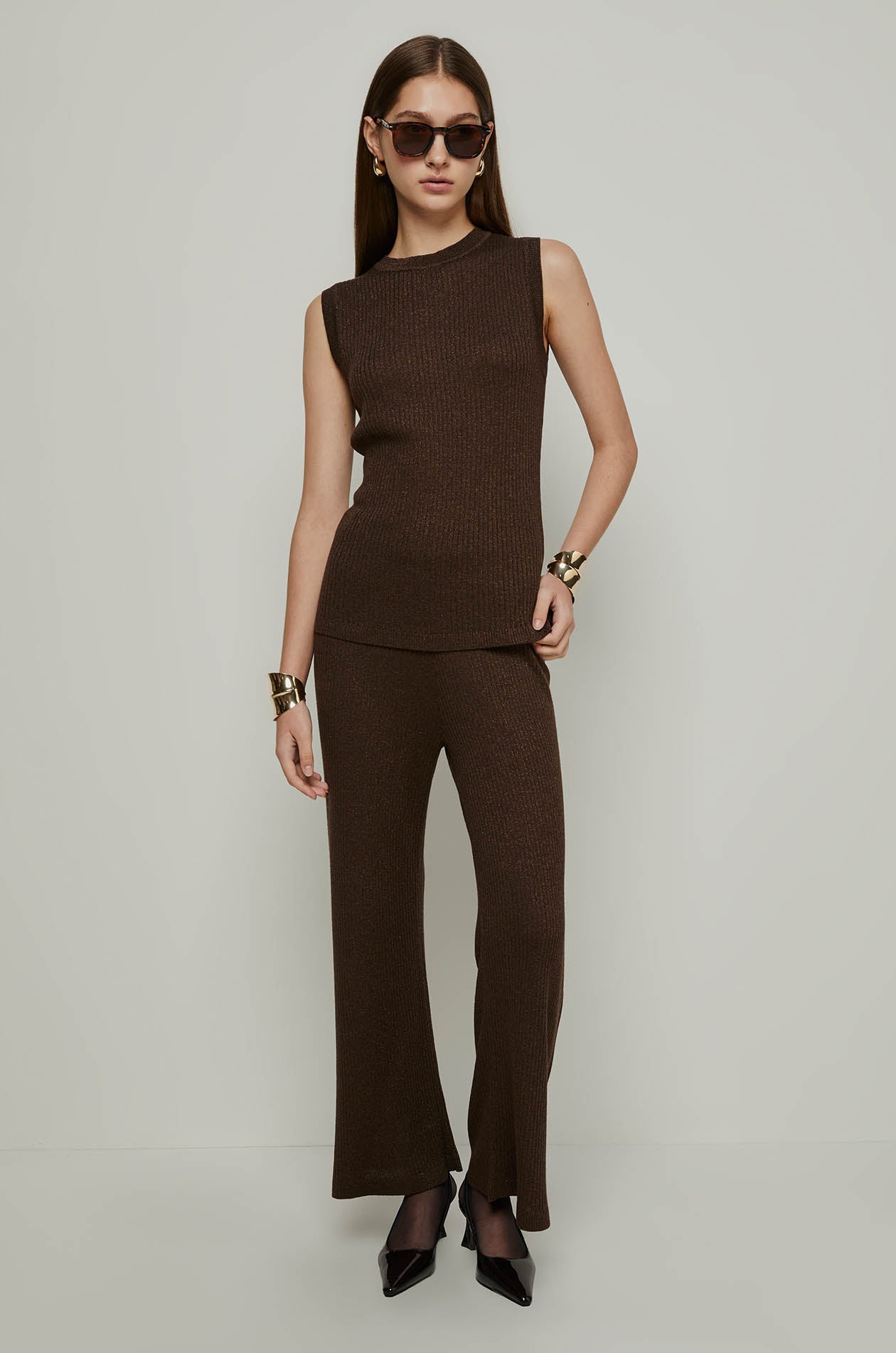 Knitted pants designed with a mid rise waist and subtly flared legs for an elongated silhouette. The stretch knit fabric ensures comfort while keeping a polished look, making them versatile to pair with blouses, cardigans, or matching knit tops for a coordinated style.