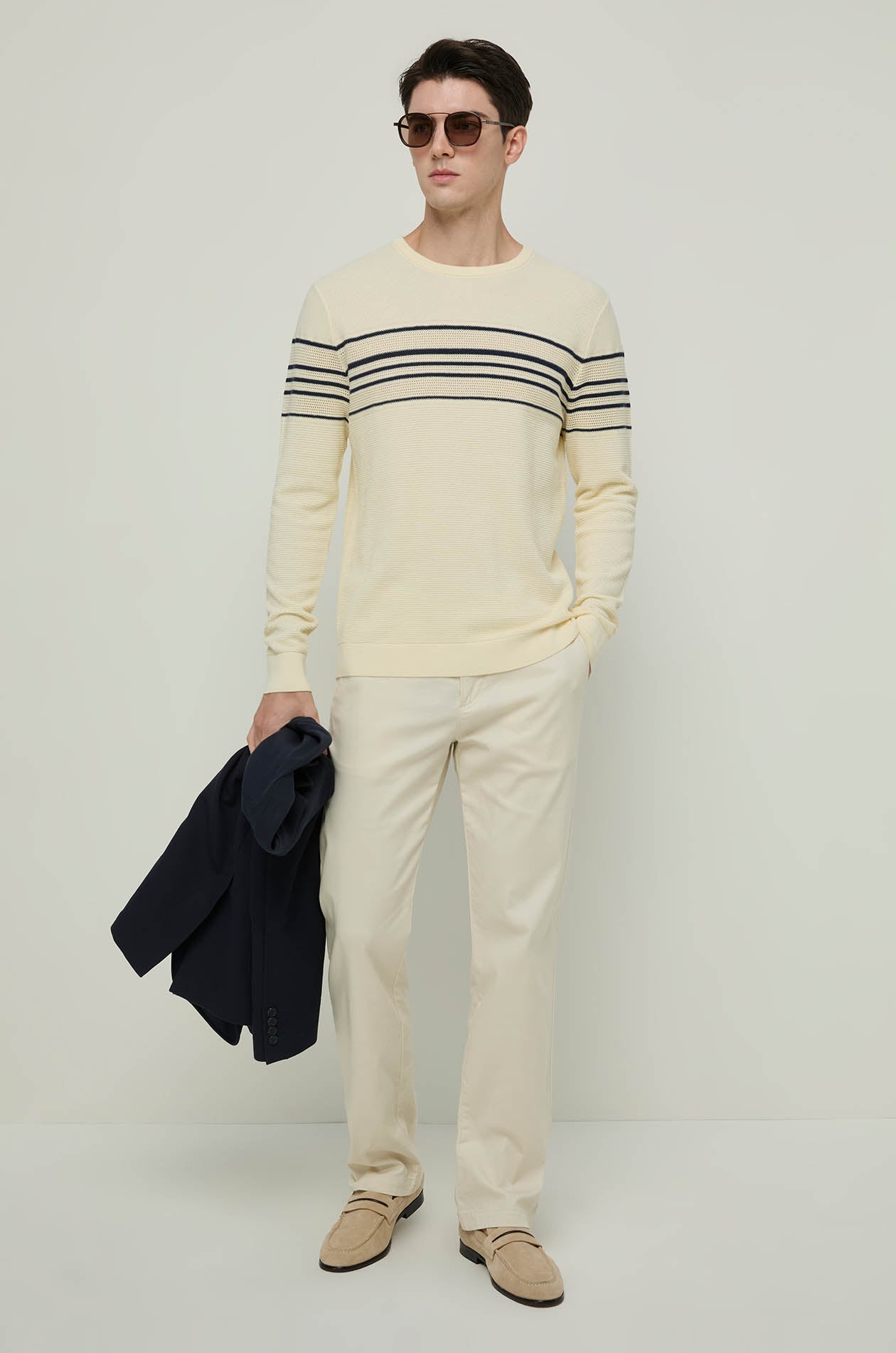 A long-sleeve T-shirt with fine navy stripes that create a simple and relaxed look. The loose knit fit gives a sense of ease and allows natural movement, perfect for effortless everyday styling.