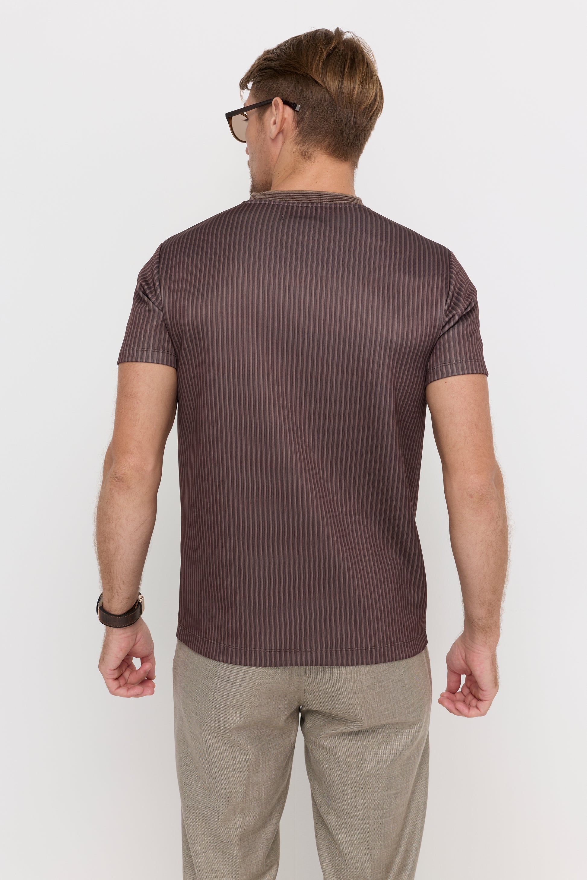 A regular-fit T-shirt designed with fine vertical pinstripes that create a sleek, elongating effect. Crafted from a soft knit fabric, this piece offers a smooth, breathable feel while maintaining a refined appearance. The clean crew neckline and subtle embroidered chest detail add a minimal yet polished touch. Ideal for everyday wear, it pairs effortlessly with both tailored pieces and casual bottoms for a modern, versatile look.
