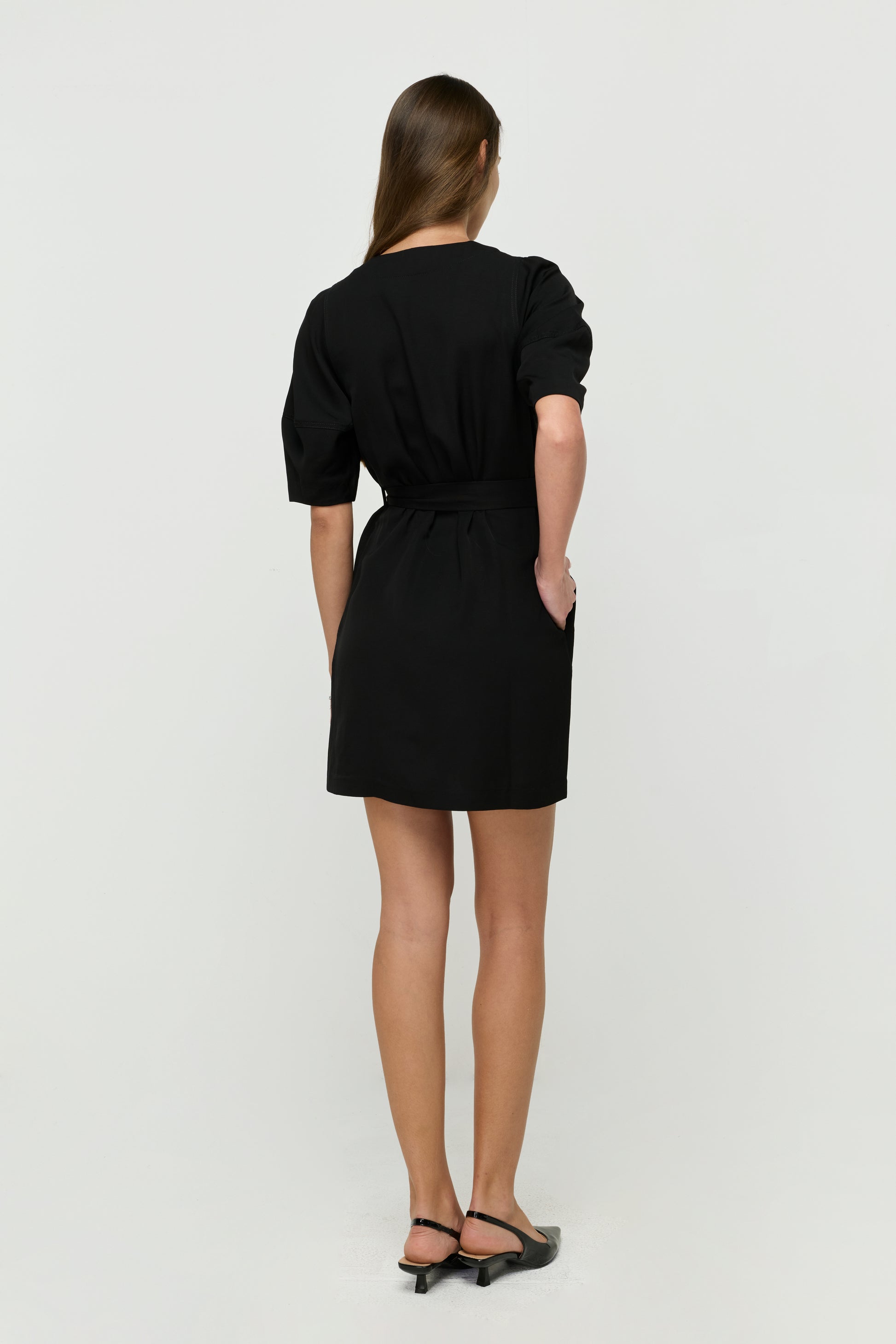 A regular-fit short dress designed with a clean V-neckline and a button-front closure that creates a refined, minimal look. The adjustable waist tie enhances the silhouette with a flattering, cinched shape, while the structured fabric gives it a polished finish. Perfect for both everyday wear and smart casual occasions, easy to style with flats or heels depending on your mood.