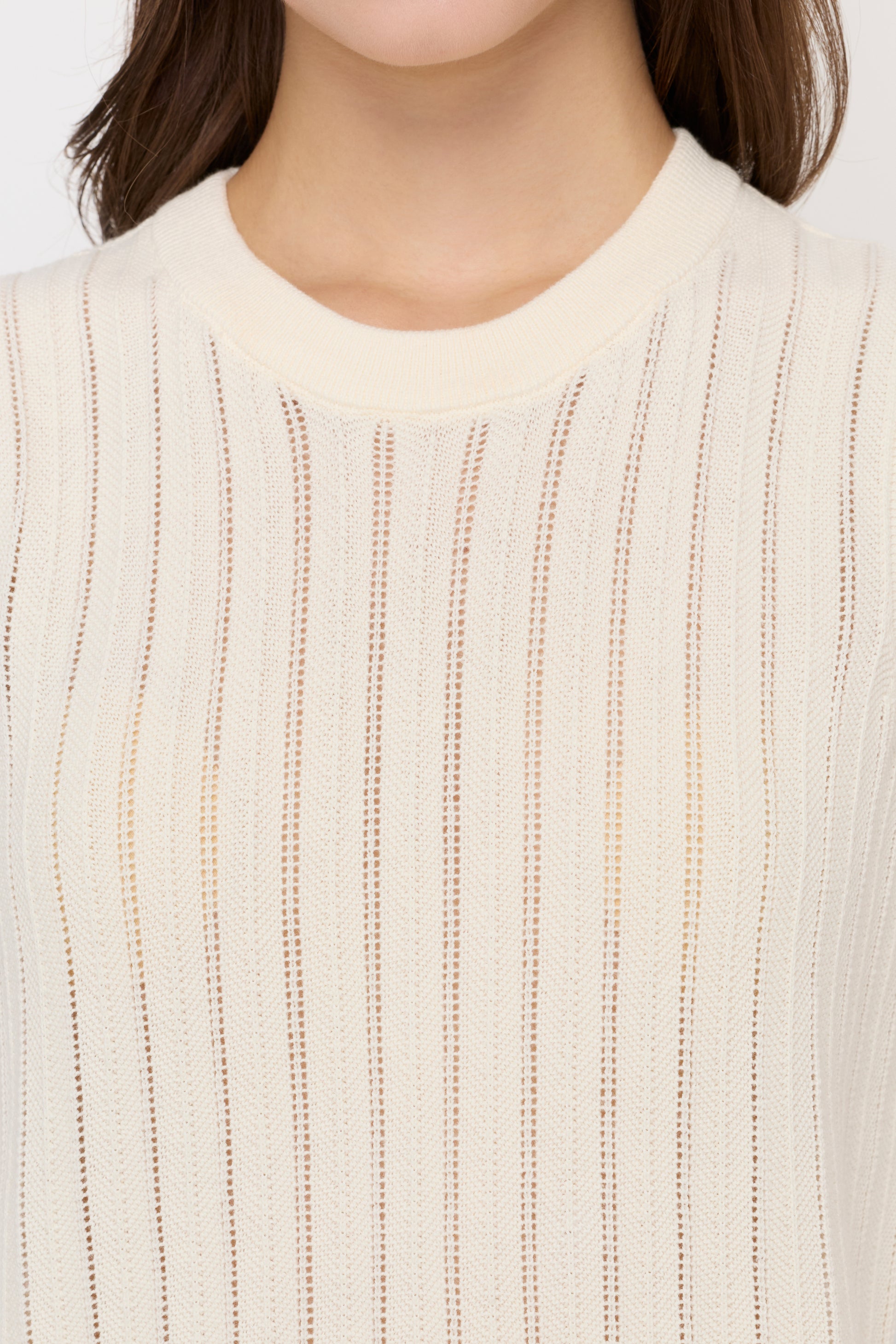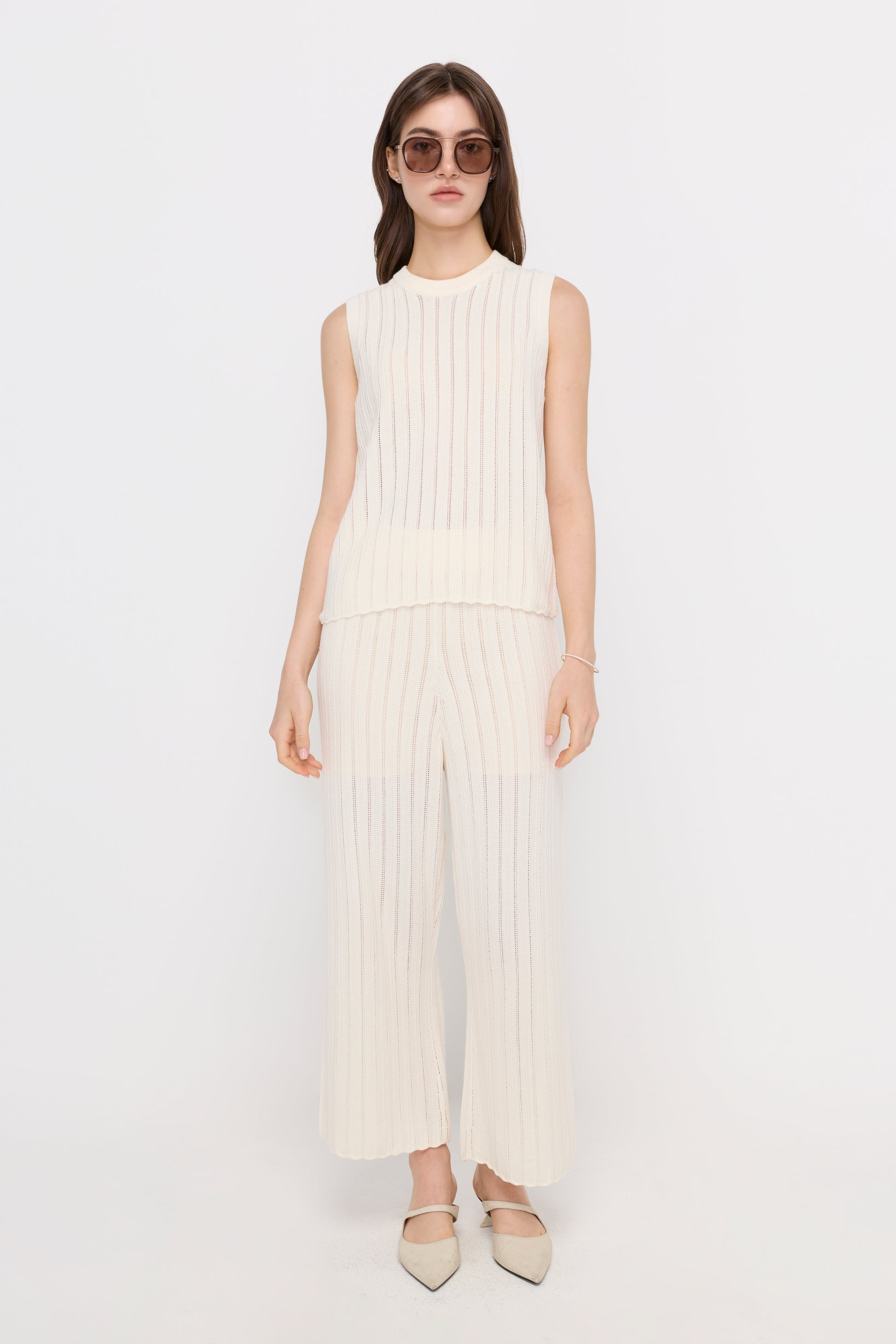 A regular-fit sleeveless knit top designed with a clean round neckline and a refined vertical rib texture that enhances the silhouette. The breathable open-knit structure adds lightness and subtle dimension, making it ideal for warm-weather layering or standalone wear. Effortlessly styled with tailored trousers or casual bottoms for a polished everyday look.