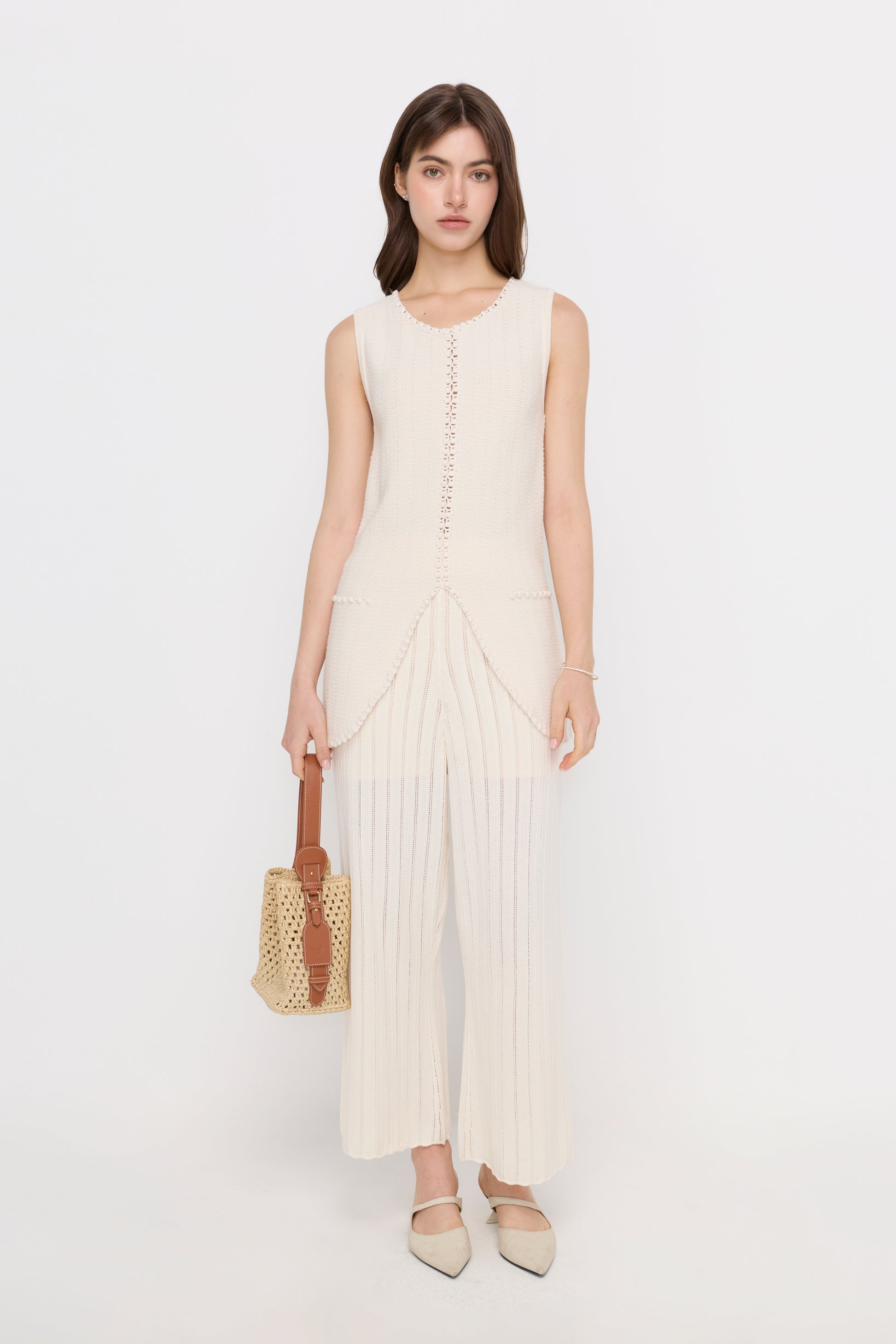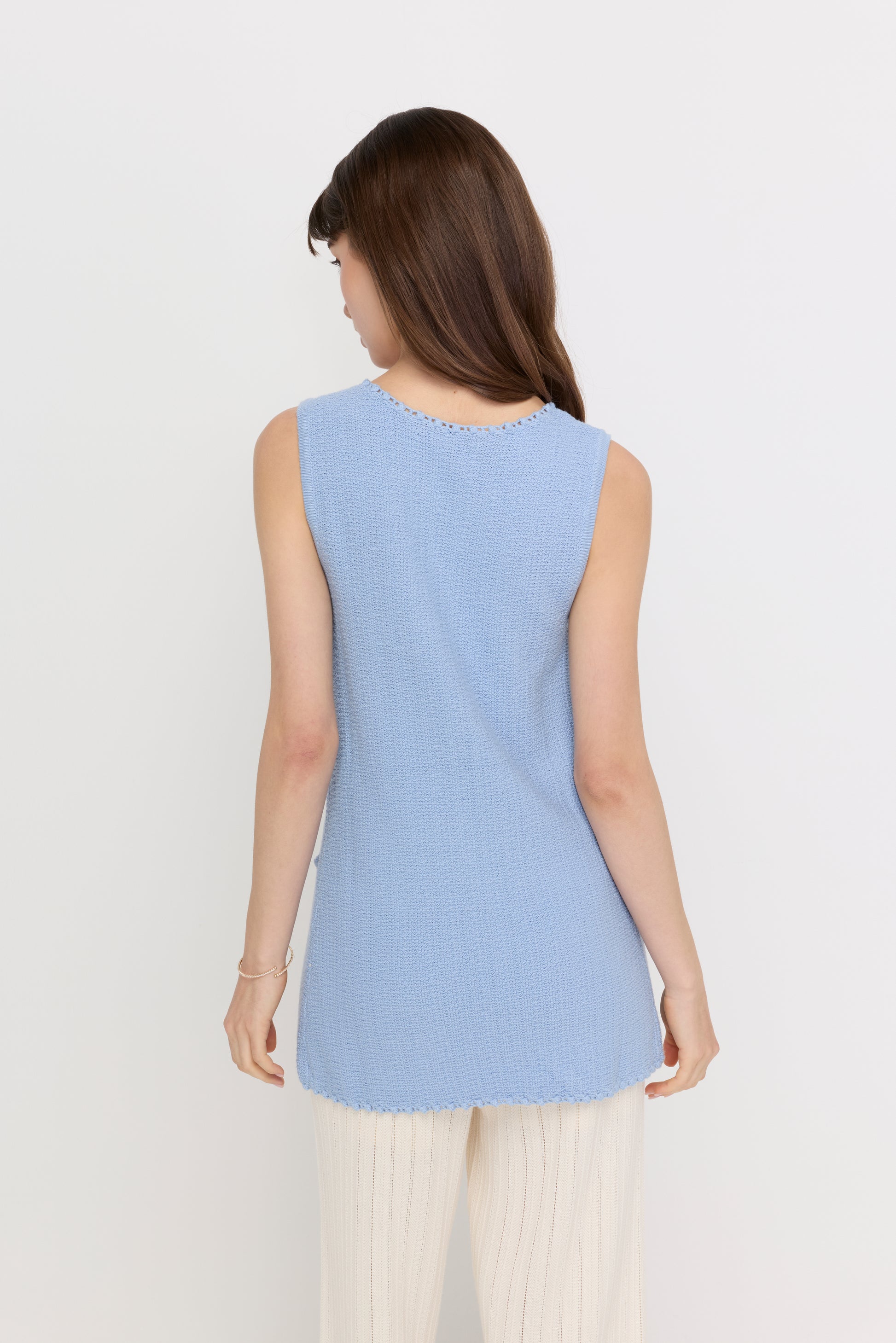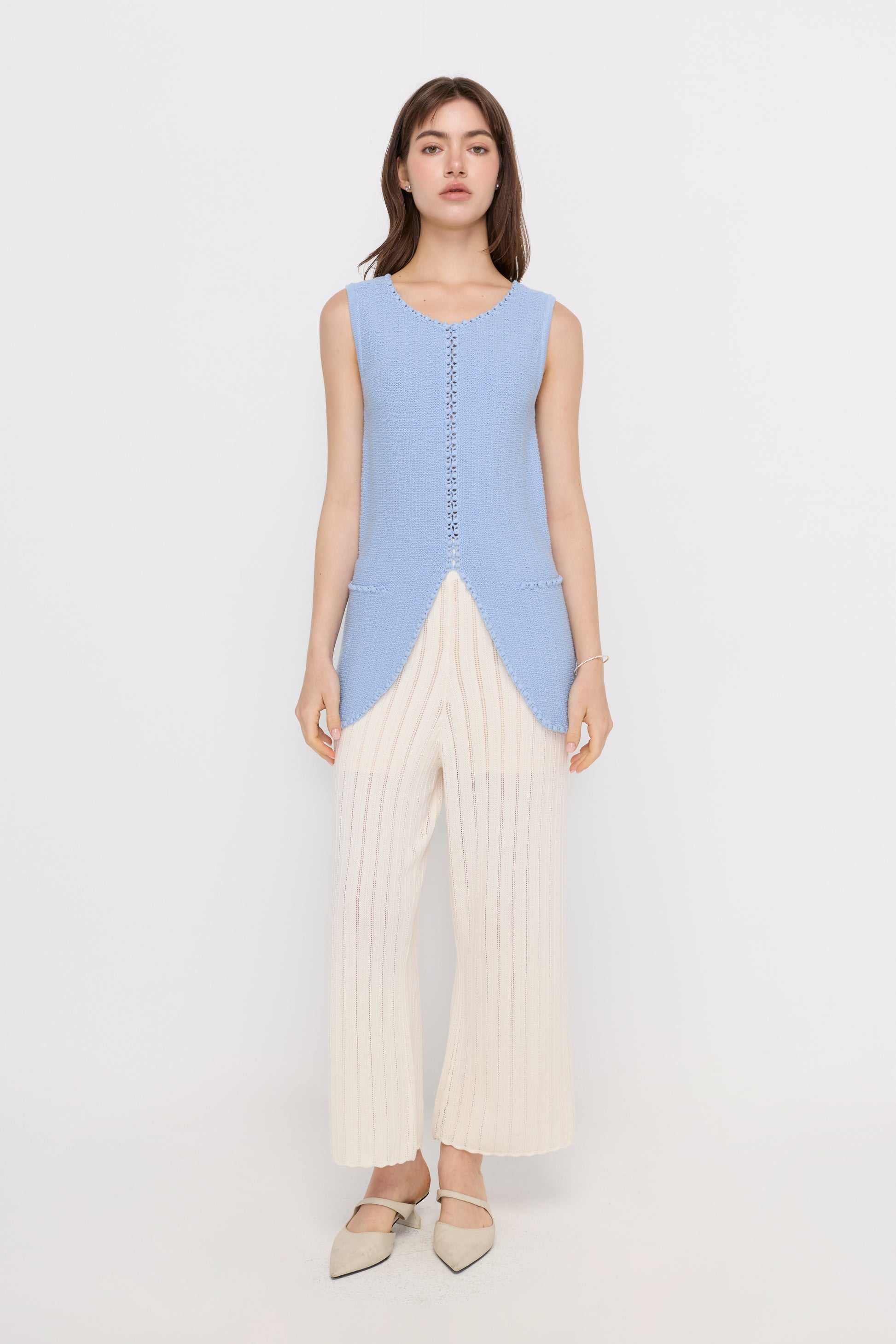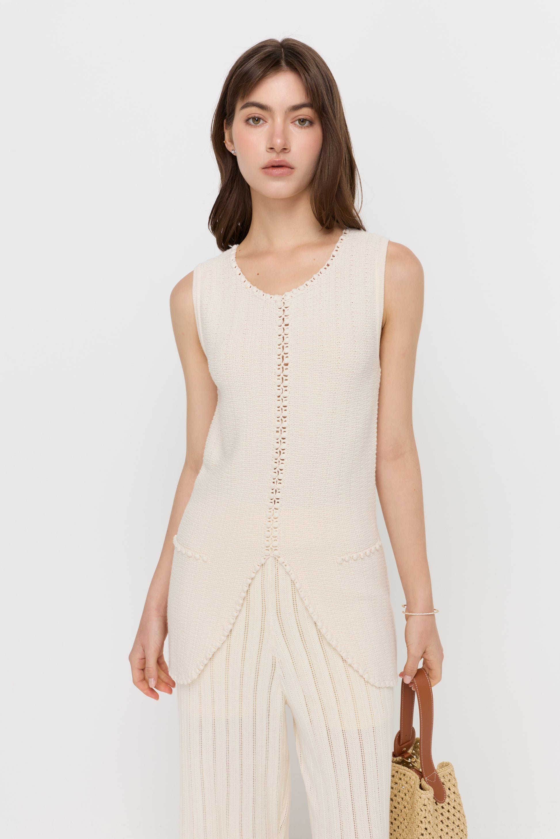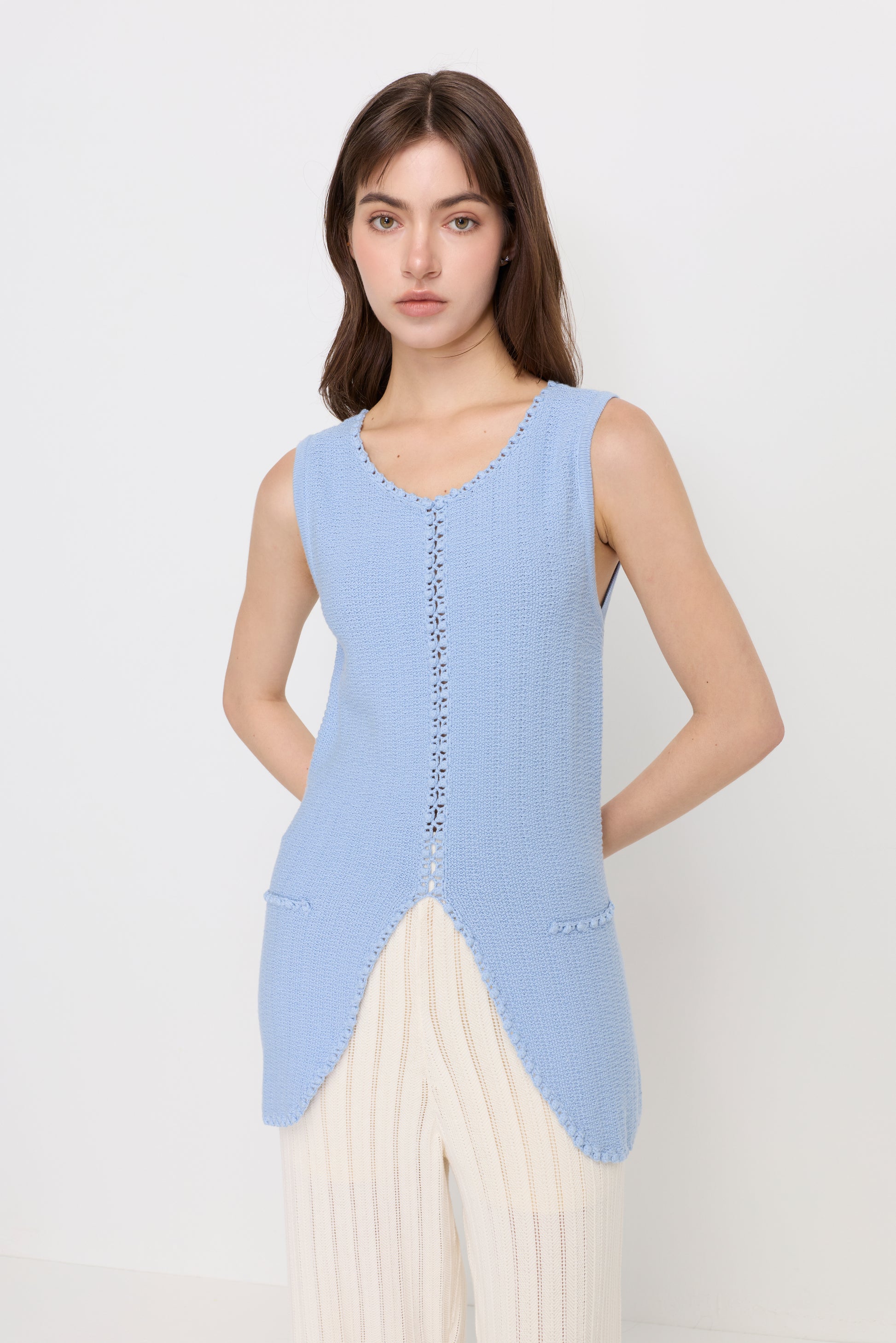 A regular-fit sleeveless long vest designed with a soft textured knit and delicate trim detailing along the edges. The open front with a subtle curved hem creates a relaxed yet refined silhouette, while the extended length adds elegance and versatility. Perfect for layering over simple tops or dresses, bringing a polished touch to everyday styling.