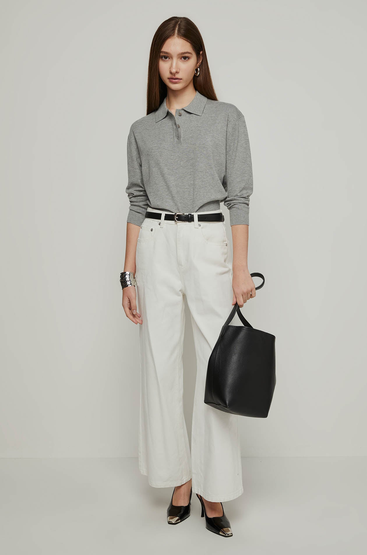 This long-sleeve knit polo in light grey offers a modern yet minimalist look. Featuring a classic collar and a three-button placket at the front, it allows adjustable styling. The fabric is soft, slightly stretchy, and comfortable, perfect for both workdays and relaxed weekends.