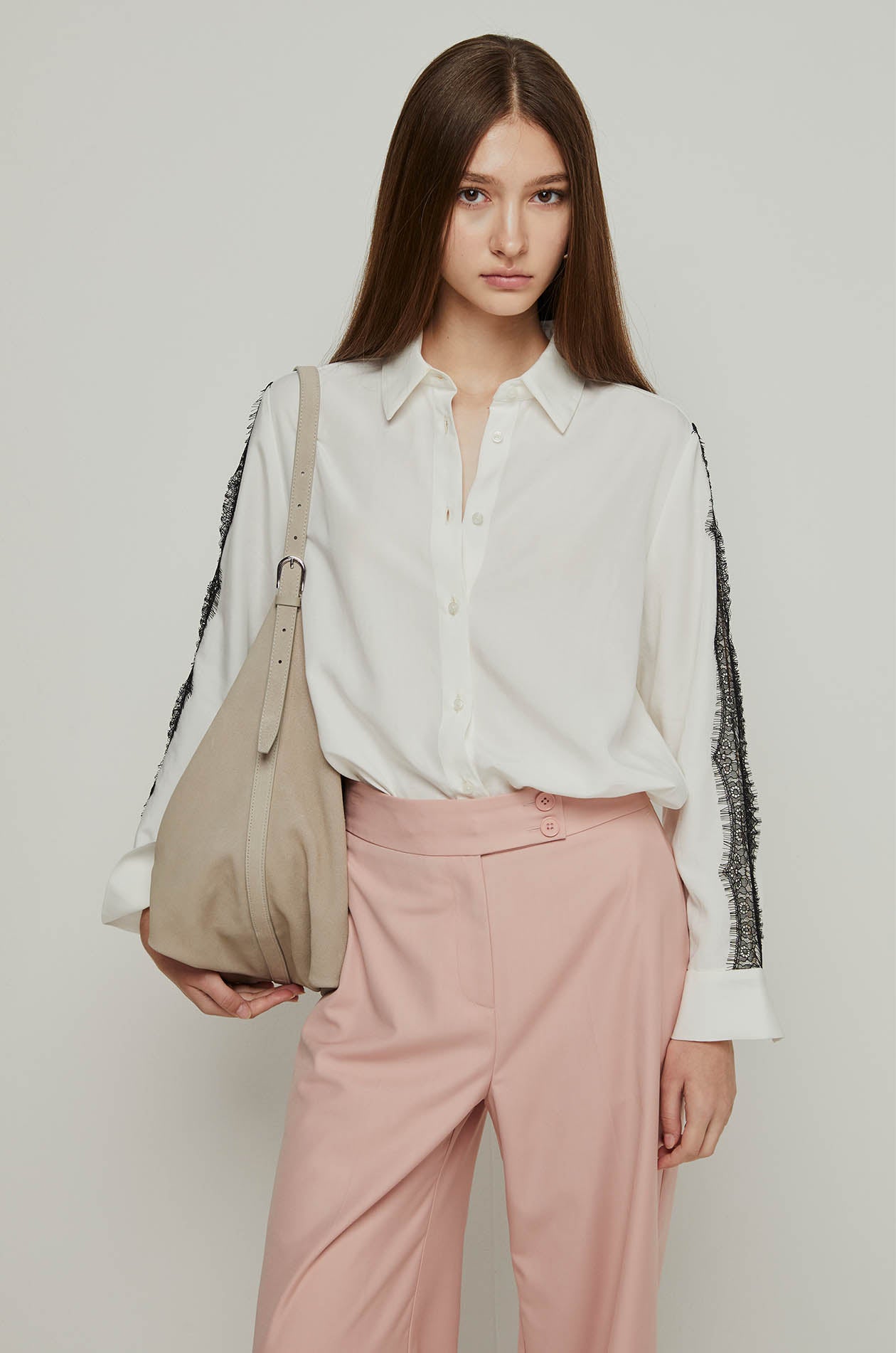 A relaxed fit shirt highlighted by lace panels along the sleeves for an elegant contrast. Designed with a classic collar and front button closure, it transitions effortlessly from office wear to evening outings when paired with tailored pants or skirts.
