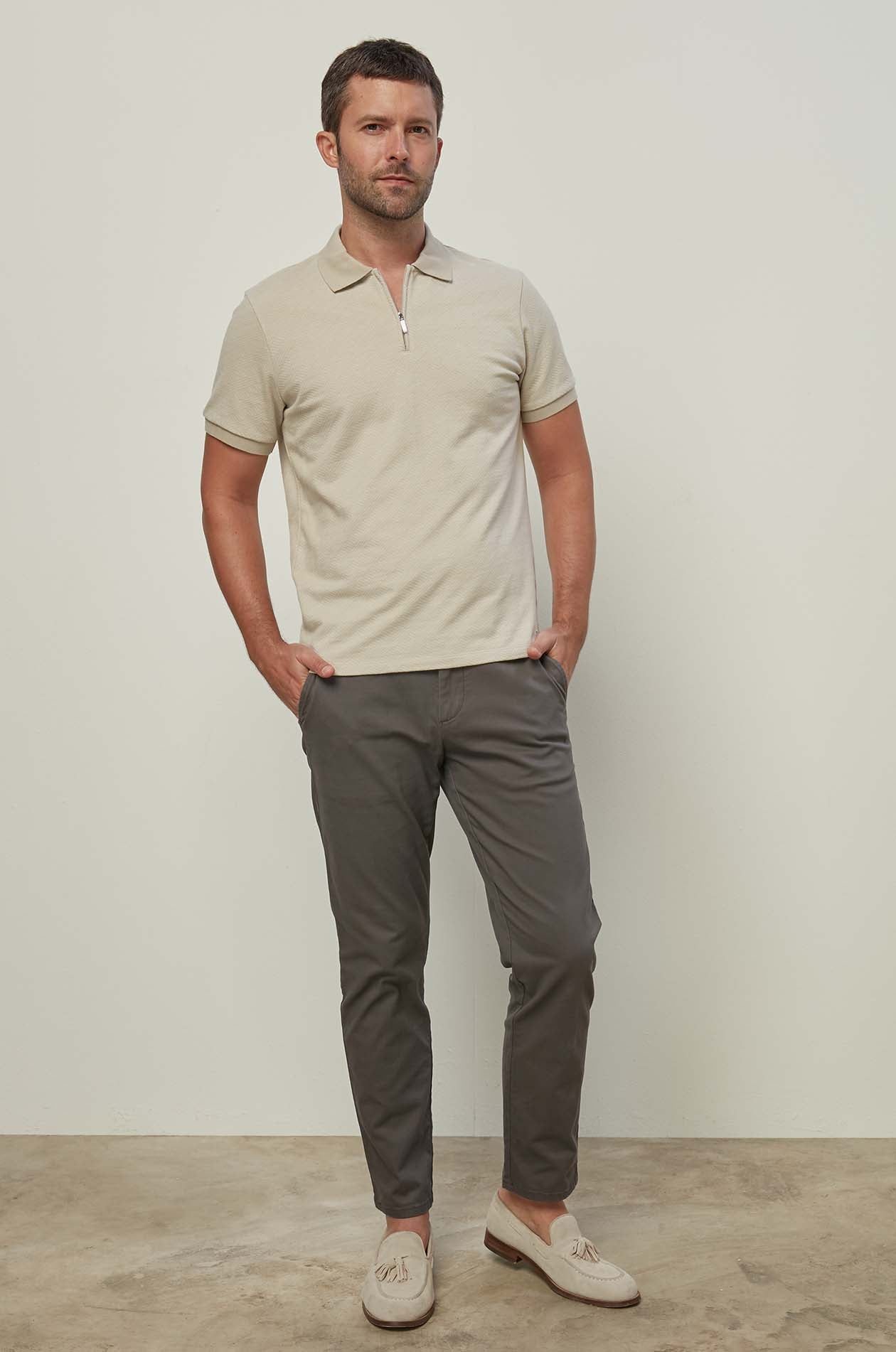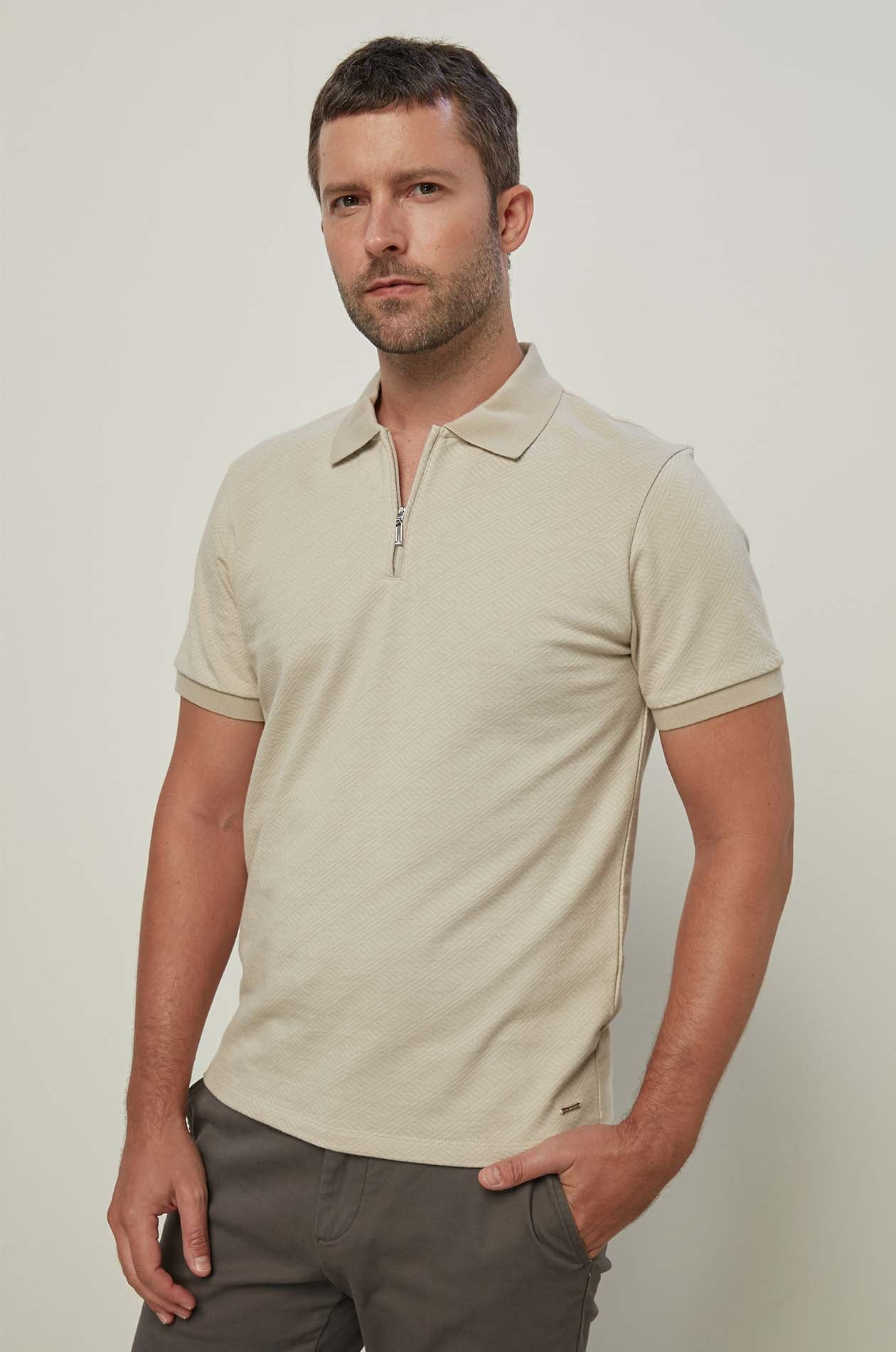 A short-sleeve polo shirt in a refined printed beige jacquard fabric. The standout feature of this design is the textured fabric, giving it a sophisticated and premium appearance. The zipper and structured collar in minimalist styling make it ideal for business casual or weekend wear — a perfect choice for those who value subtle elegance in their wardrobe.