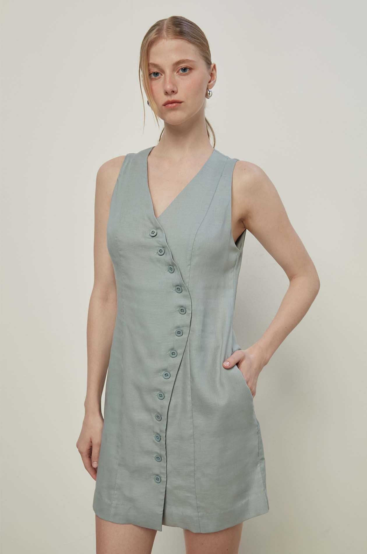 This sleeveless dress features a graceful V-neckline and a distinctive curved button placket that adds a refined twist to a classic silhouette. The above-the-knee length offers a youthful, feminine charm while maintaining a polished appearance. Designed to flatter with clean lines and thoughtful detailing, this dress effortlessly transitions from day to evening, making it a timeless piece that brings understated elegance to any occasion.