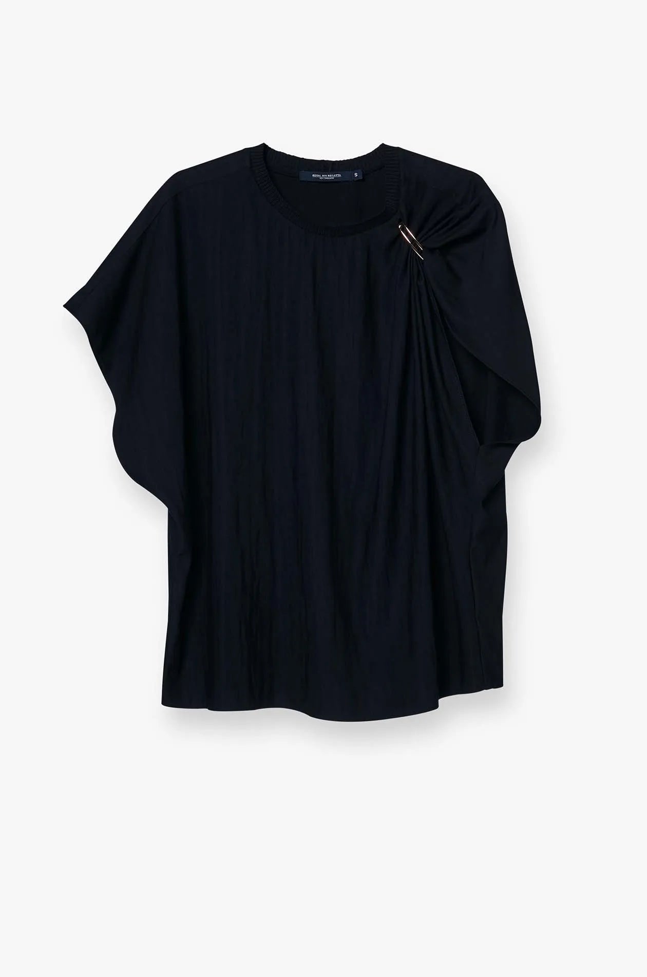 This blouse features a graceful round neckline and a striking one-shoulder draped detail that adds a sophisticated touch. The relaxed fit offers comfort while maintaining an effortlessly elegant silhouette, perfect for special occasions or refined everyday style.
