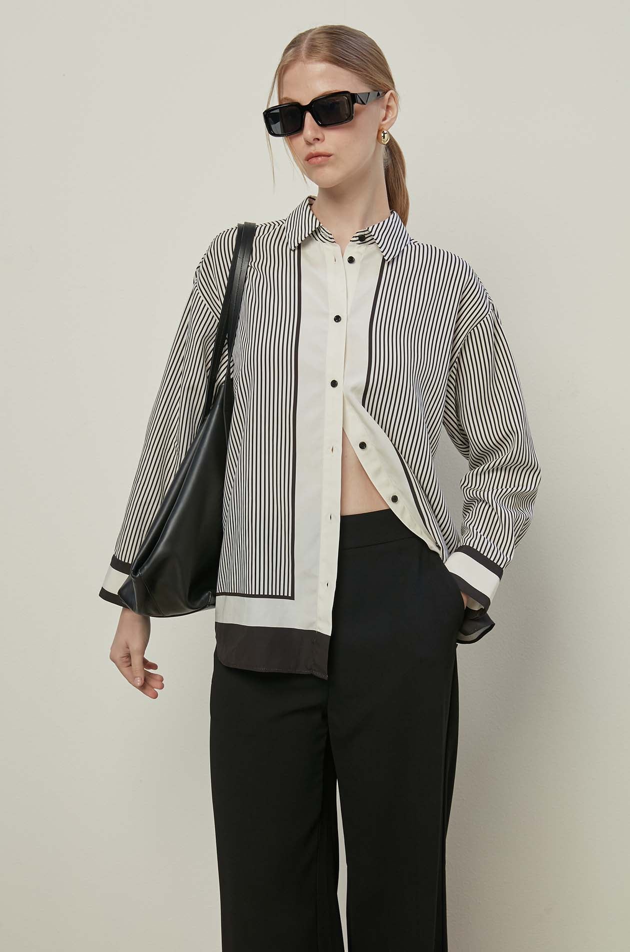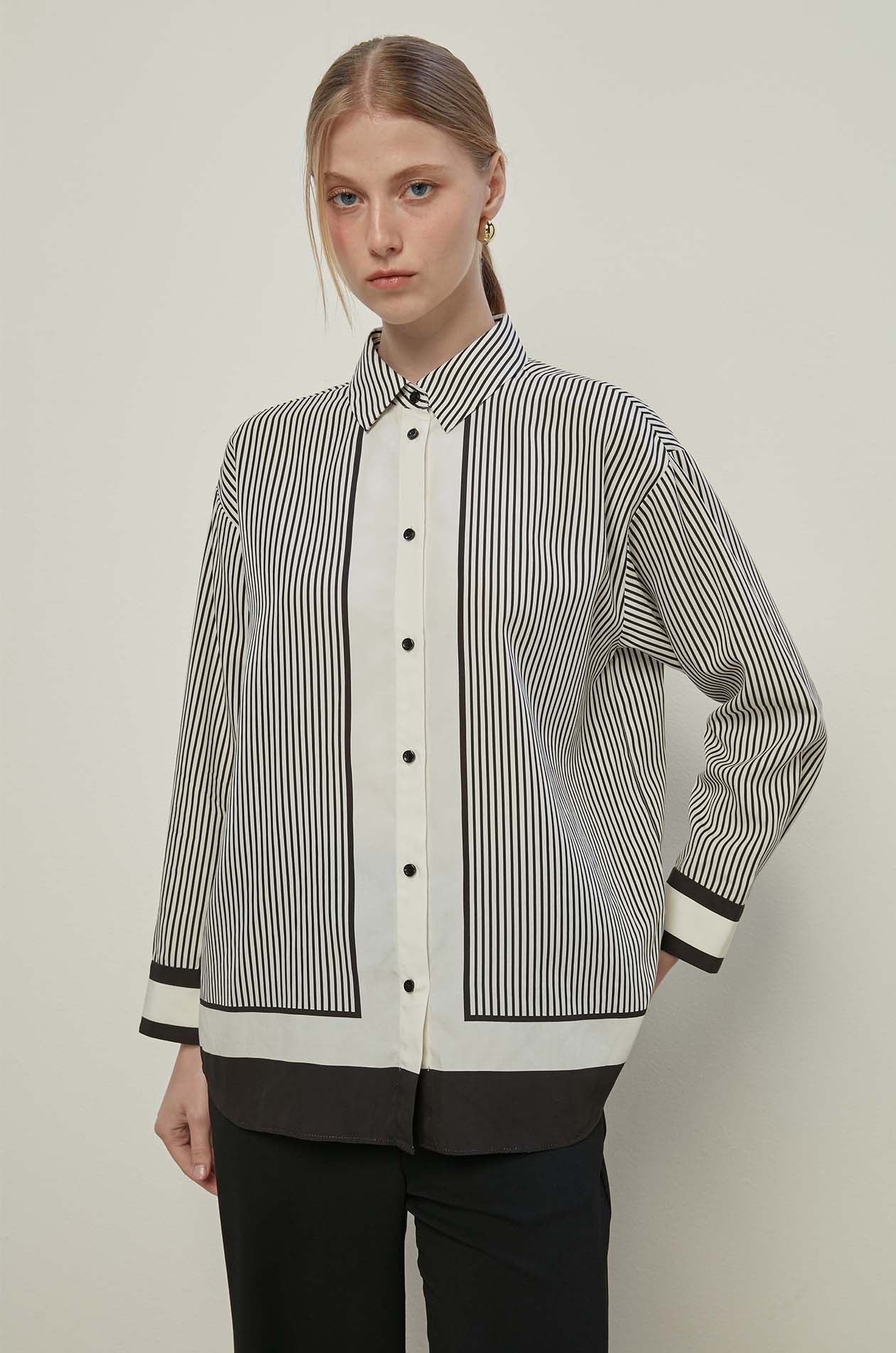 This striped button-up shirt offers a timeless blend of classic design and modern comfort. Featuring a wide spread collar and dropped shoulders, it provides a relaxed silhouette that drapes effortlessly. The front button opening and long sleeves with buttoned cuffs add subtle detailing, making it versatile for both casual and polished looks. Crafted for ease and style, this shirt is perfect for those who appreciate refined simplicity with a gentle, feminine touch.