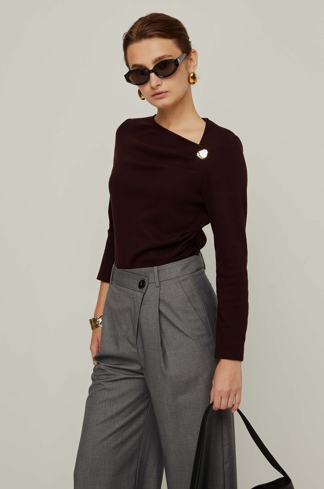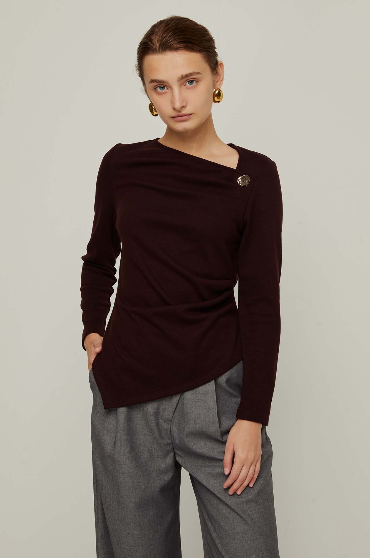 This eye-catching asymmetric top is made from soft, stretchy jersey fabric, ensuring both comfort and style. The unique design features a draped silhouette with a single shoulder detail, adding a modern twist to a classic look. The rich purple color enhances its elegance, making it perfect for both casual outings and special events. Ideal for pairing with tailored pants or skirts, this top is a striking addition to any fashion-forward wardrobe